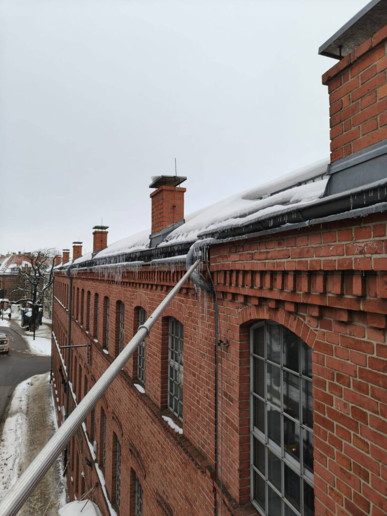 9.02.2026 – o godz. 10.14 – jednostka zadysponowana do usunięcia sopli nad chodnikiem z budynku Fabryki Sztuk.