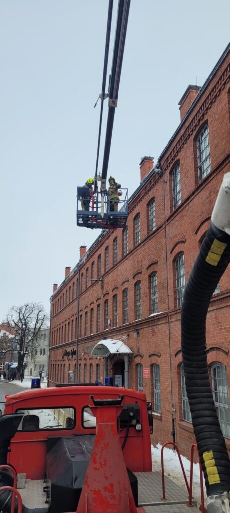 29.01.2016 – o godz. 16.48 – jednostka zadysponowana do usunięcia zwisających nad chodnikiem sopli z budynku Fabryki Sztuk.